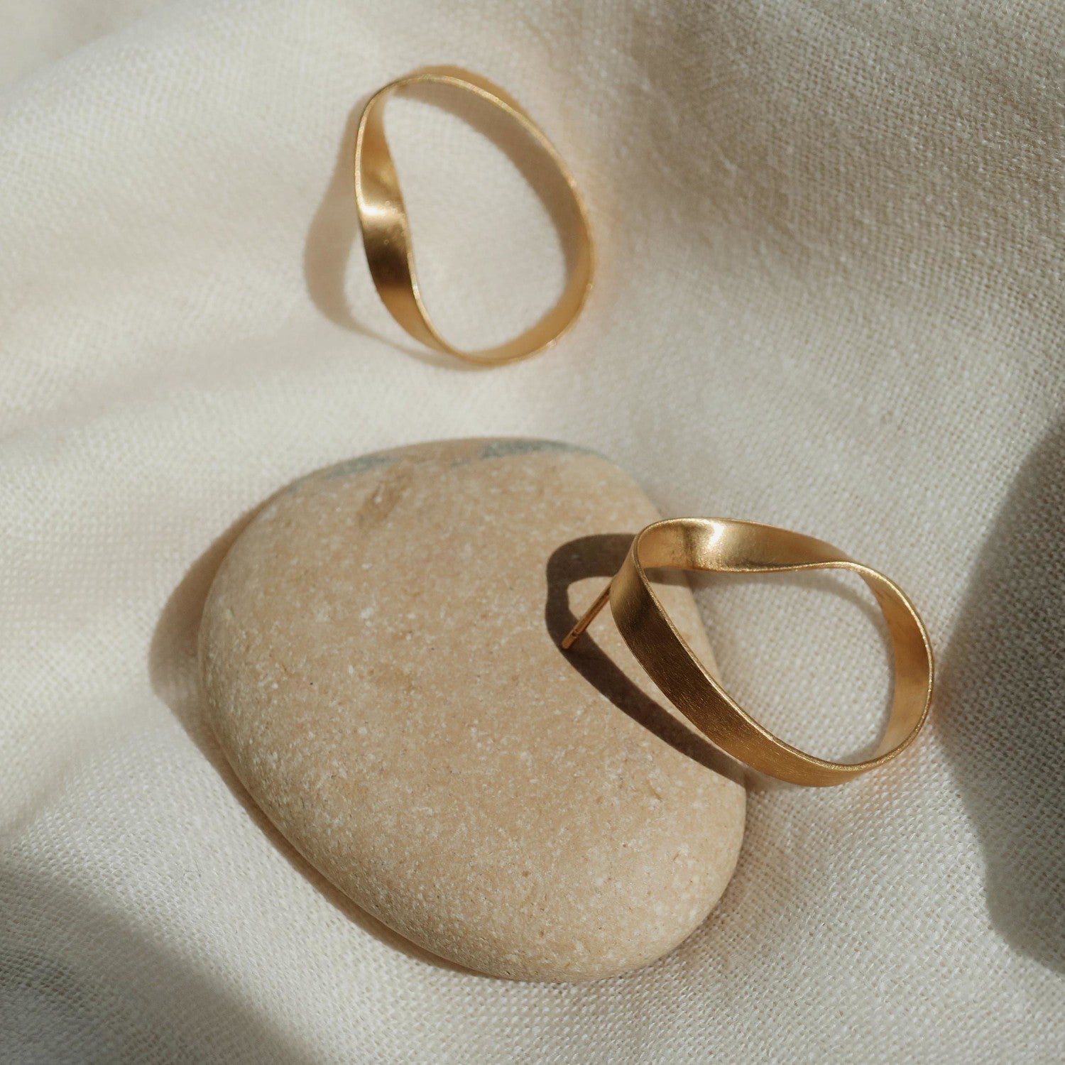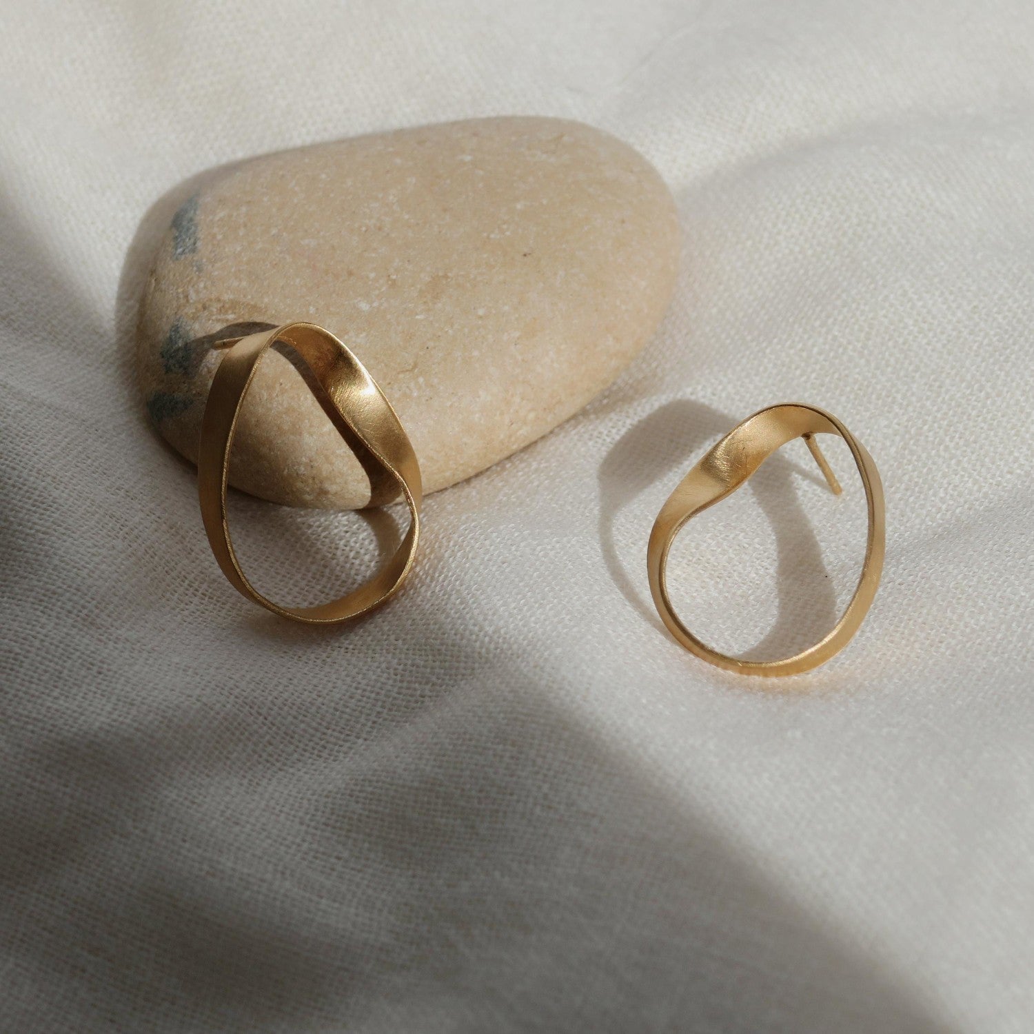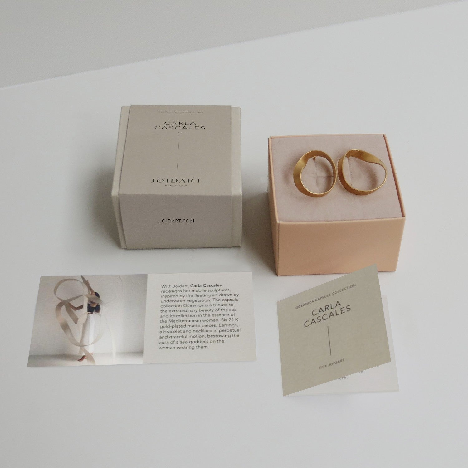 Un par de aros que reinterpreta con elegancia la forma de las olas. Diseñados por CARLA CASCALES y hechos a mano en Barcelona, los Oceánica medianos de Joidart están elaborados en latón bañado en oro de 24K, con un diseño fluido y ondulado que evoca el vaivén del mar sobre la arena.