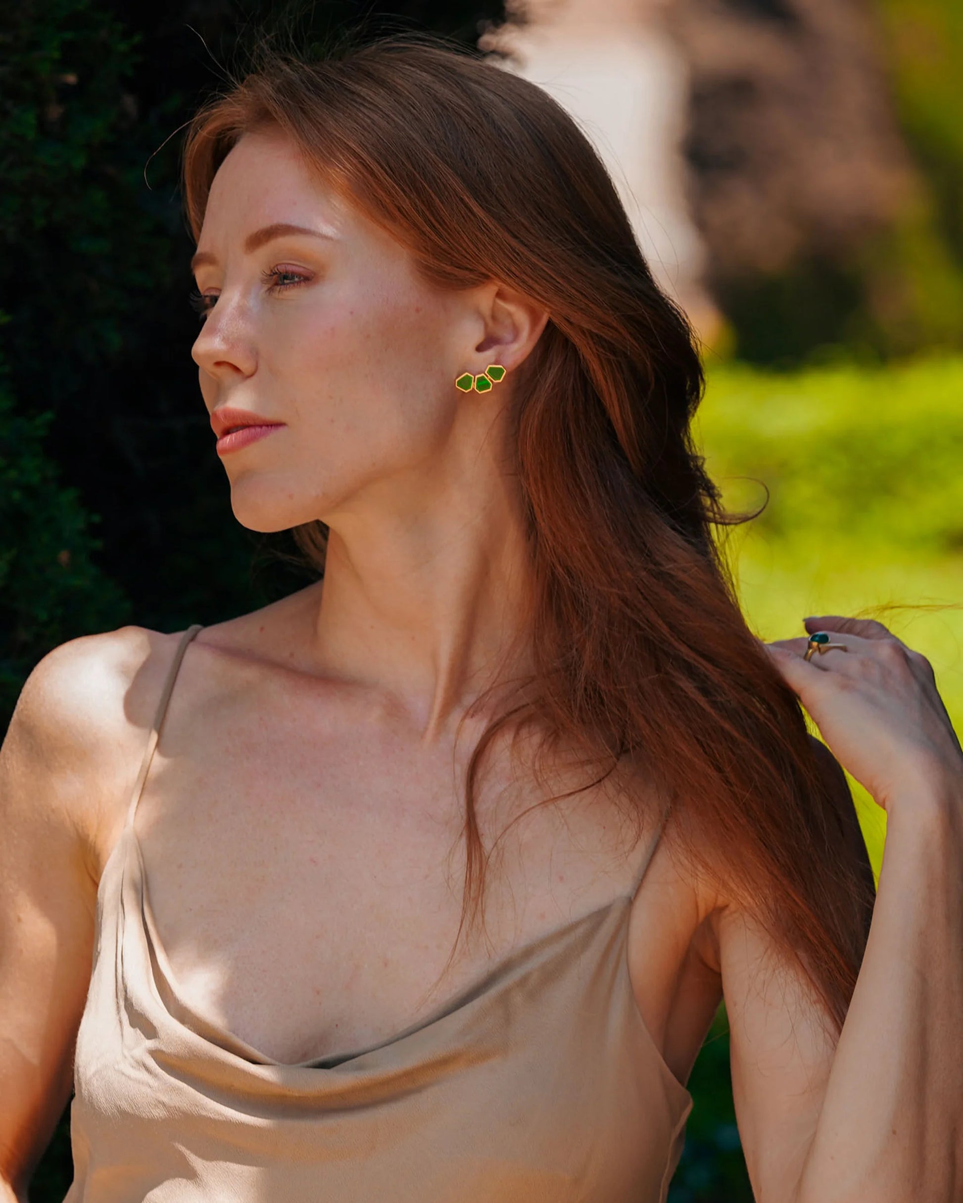 Estos aros Samir en dorado y onix verde son una opción versátil y elegante, parte de las creaciones más recientes diseñadas por Tiahra en España.